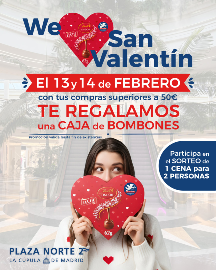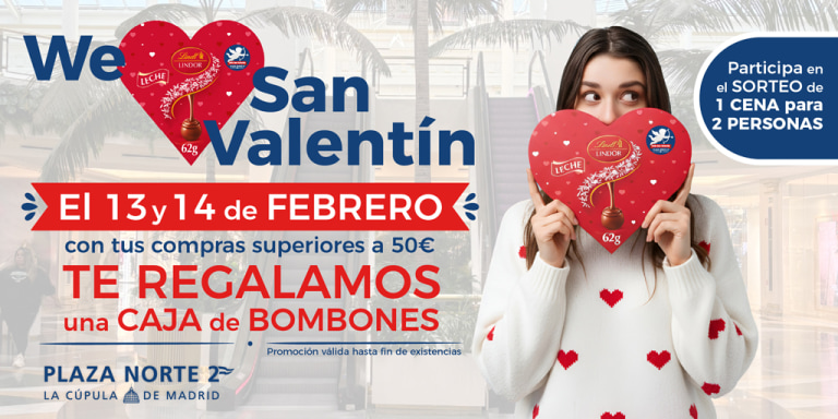 ¡Feliz San Valentín en Plaza Norte 2! Los días 13 y 14 de febrero, por una compra superior a 50 €, enseña tu tiquet en el Punto de Información y te entregaremos una caja de bombones Lindt* con forma de corazón.