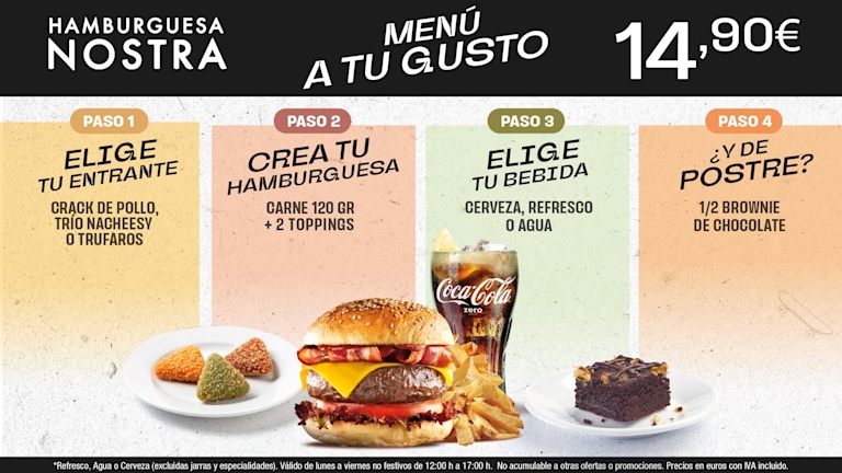 Ven a Hamburguesa Nostra y disfruta de su menú de lunes a viernes, con una relación calidad-precio inigualable.